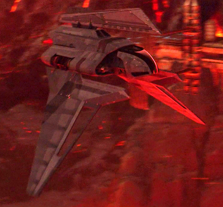 Emperor Palpatine's Theta-class shuttle arrives on Mustafar to rescue Darth Vader.