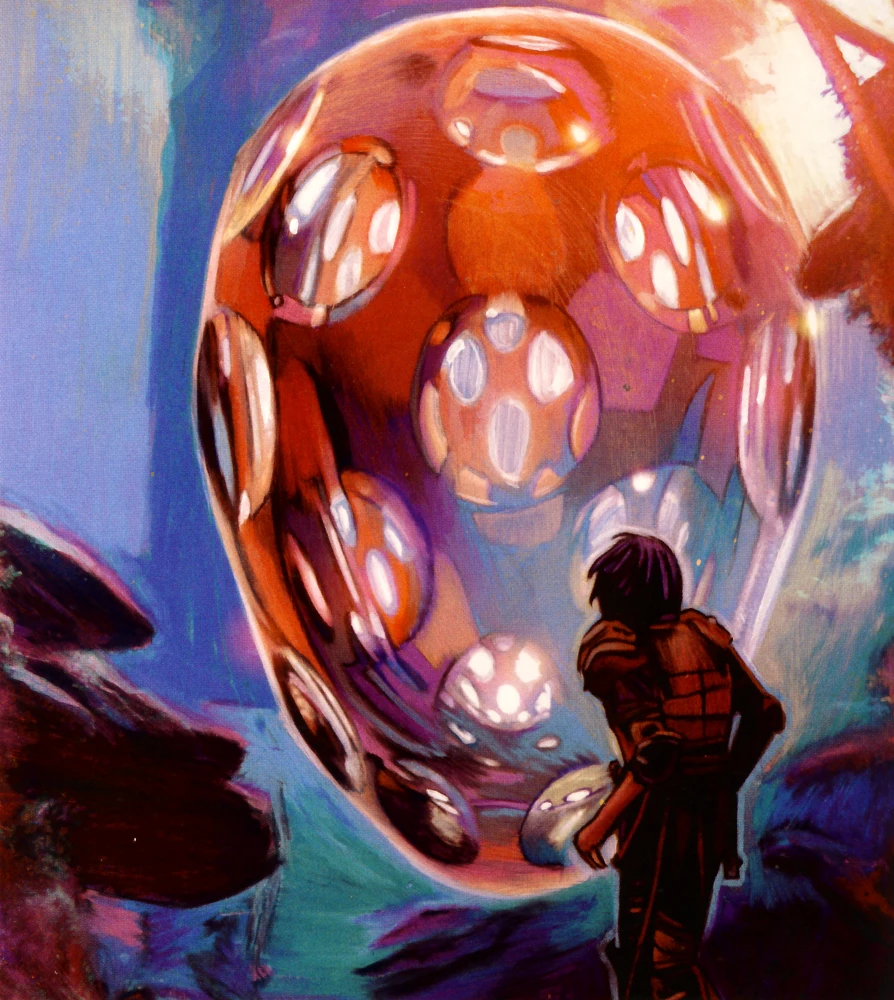 A simple clap of the hands instantly detonated the thought bomb[2] and transformed the essences of the affected into an oblong sphere[7] that absorbed all light but emanated a pale radiance of its own and thrummed with rhythmic vibrations. The dull gray, flat-surfaced, slightly nacreous orb shimmered with the smoke-like shadows of its trapped victims, and, though they often found it grotesquely repulsive, living beings in its presence were compelled to gaze upon the end result of the thought bomb. It hovered a meter above the ground, was four meters from top to bottom, and had a circumference of roughly three meters.[4] The ovoid, which resembled another ancient Sith weapon in size and shape,[8] burned with a cold fire upon touch, and the shadows within converged on the point of contact to whisper suggestions of hate and despair to the curious.[9]