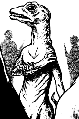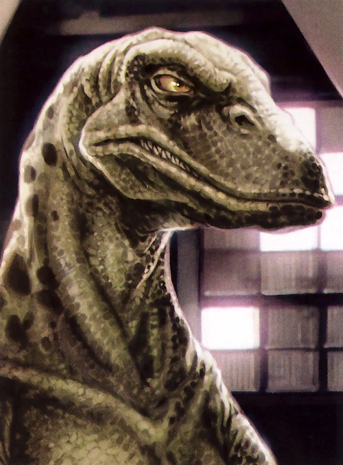 The Tiss'shar were bipedal therapods descended from predatory reptilians native to the humid jungle continents of Tiss'sharl.[2][1] They were relatively strong and agile, with long necks, slender torsos, wider hips, and a short but wiry tail. Their mouths were filled with short, sharp teeth, and their large tongues were pink and constantly moving. Their large eyes were black and appeared glassy as a result of the clear, resilient film that covered and protected them.[1] Many Tiss'shar had prominent sickle-shaped claws on the first toe of their feet; some also possessed a crest of feathers atop their heads.[4]