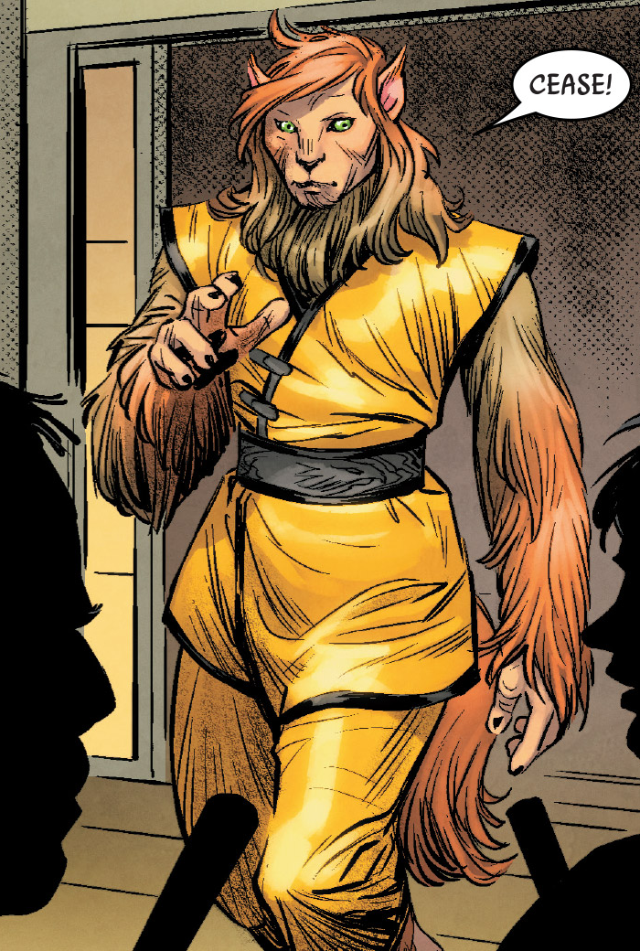 Togorians were a sentient species of large, feline beings with digitigrade feet. Their bodies were covered in short, thick fur that could be brown, white, orange or red with stripes, and their eyes could be yellow or green with a yellow hue. Togorians had retractable claws, and were a proud race. They moved with grace and spoke with a sibilant voice. H'sishi, owner of the Amon Yinchom Dojo, was a female Togorian.[1] The male Jedi Knight Jak'zin, who encountered Count Dooku on Sullust, was a Togorian.[2]