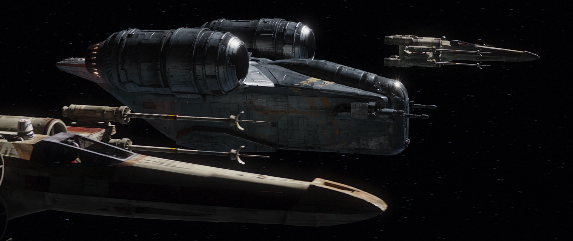 Piloting T-65B X-wing starfighters, Wolf and his squadron exited hyperspace near the station. As they passed the Razor Crest, which had just left the station, Wolf confirmed that the beacon's signal was definitely coming from within the station. He then noted that there seemed to be another gunship preparing to launch from the station, which had been preparing to destroy the Razor Crest; however, the New Republic pilots took it as reason to attack. Opening fire with their laser cannons, the three pilots destroyed the gunship in the station's hangar and then proceeded to circle round and fire upon the exterior of the station itself,[1] destroying the Roost.[7]