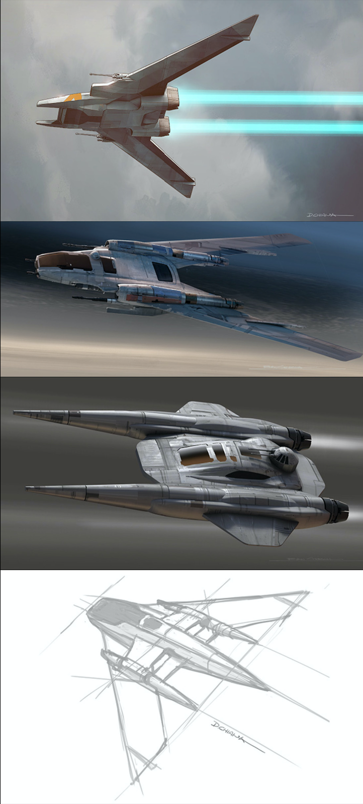 After some time, the members of Porsche travelled to Lucasfilm headquarters to determine the final design of the starship and used two days to go more in depth into the styling and details of the ship. With the various designs printed out, the team began physically cutting and pasting design features to assemble new designs. Initially, the cockpit designs were wider, but were later forgone in favor of a more compact space and putting the pilot in the middle with two co-pilots behind. This allowed for a narrow cabin, similarly attributed to that of a jet fighter plane or Formula 1 car. The way the pilots sat in the vehicle had to be Porsche-inspired and have a "sporty" vehicle. Two weeks before the deadline, the final design language of smaller and wider proportions was put in place. The collage of designs that were cut and pasted was given to Rene Garcia, a Concept Modeling Supervisor at Lucasfilm, to render the final digital model of the craft.[1]