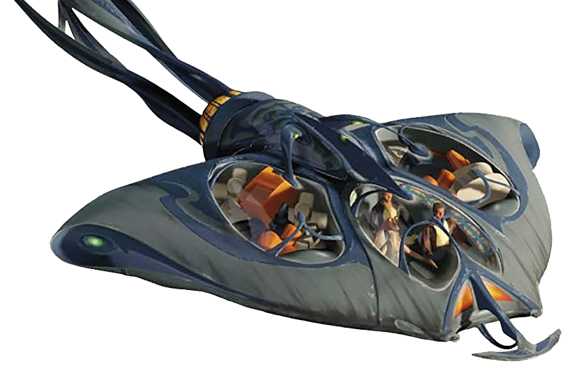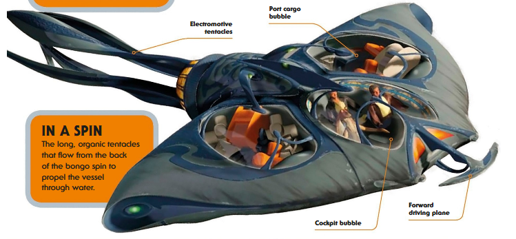 The manta-shaped hull of the bongo was organically grown from coral[6] using techniques kept secret by the Gungans, meaning that no two vehicles were exactly alike.[2] This distinctive hull, combined with the long, electromotive tentacles that flowed from the back of the vehicle and spun for propulsion, gave the bongo an appearance that resembled that of an exotic squid.[3] The hull was also heavily armored against potential attack by dangerous sea creatures found in Naboo's oceans.[4]