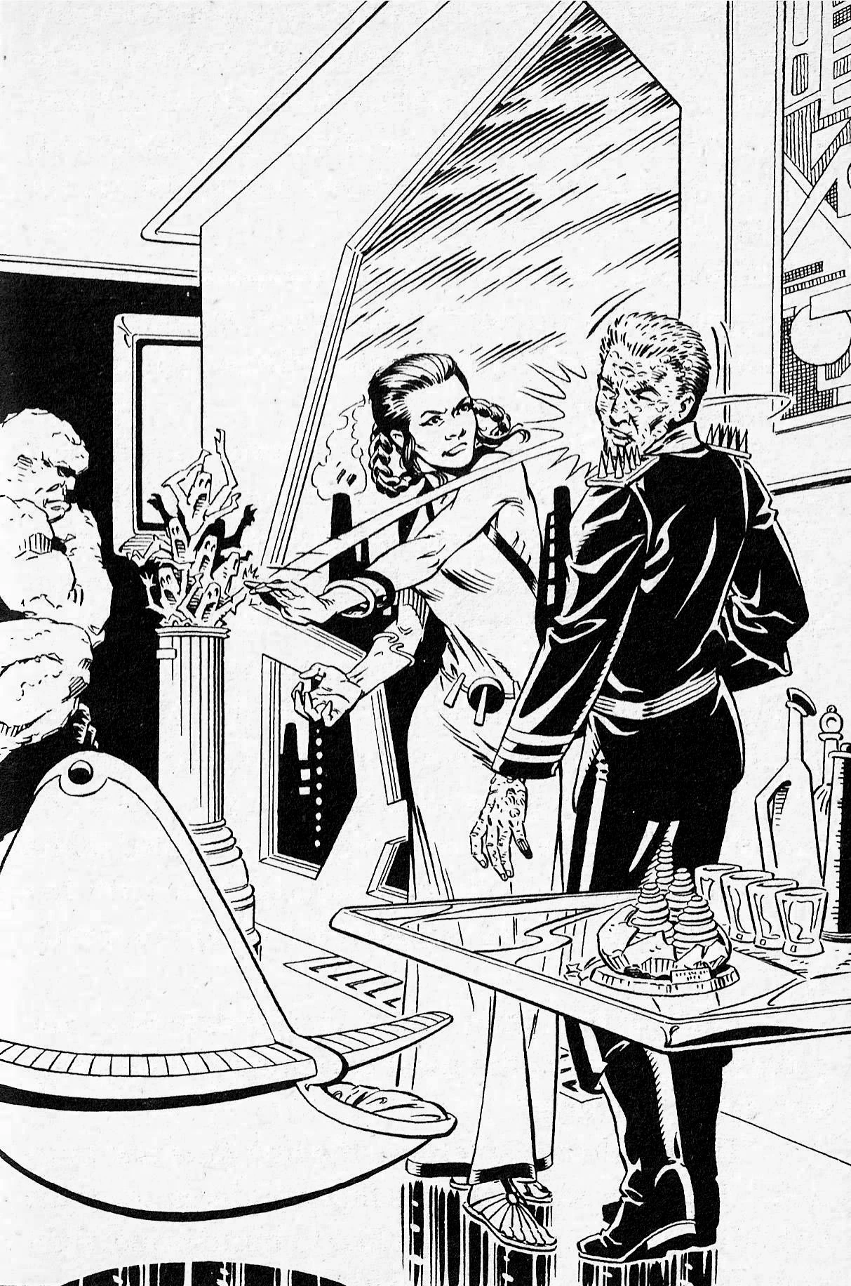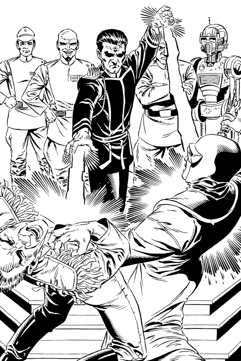 Zorba, meanwhile, had taken over Cloud City from Calrissian. Having learned of Leia Organa's complicity in the death of his son, Zorba got wind from an Imperial spy that she was being held by Trioculus. By coincidence, Trioculus's own target, Ken, had been arrested shortly before by Cloud City's police. Seeing an opportunity, Zorba arranged a meeting to negotiate with the warlord. When Trioculus interrogated Ken to assure himself that it was, in fact, the correct boy, he discovered that the danger Ken posed lay in what he had learned from the Jedi library in the Lost City; Ken was aware that Triclops, and not Trioculus, was the true son of Palpatine.[1]