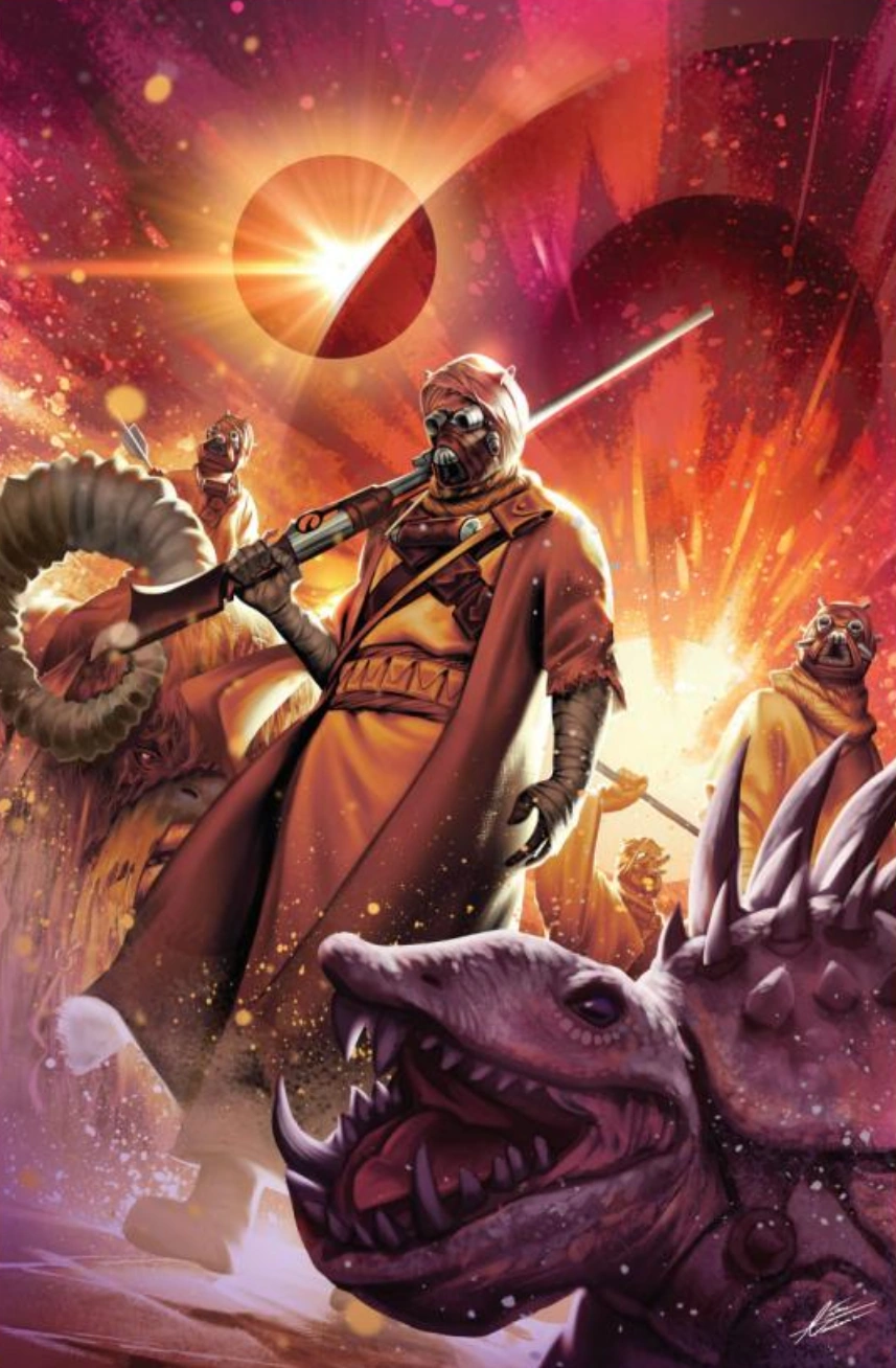 The Rebel Alliance agent Gita went undercover as a Tusken Raider sniper named Urrr'k. While undercover, Gita was recruited by the Hidden Hand's leader, Gwi, to be part of a team led by the cyborg bounty hunter Beilert Valance on a hunt for the Sith Lord Darth Vader.[34] Although Valance suspected she was an imposter because Tusken Raiders don't leave Tatooine.[35]