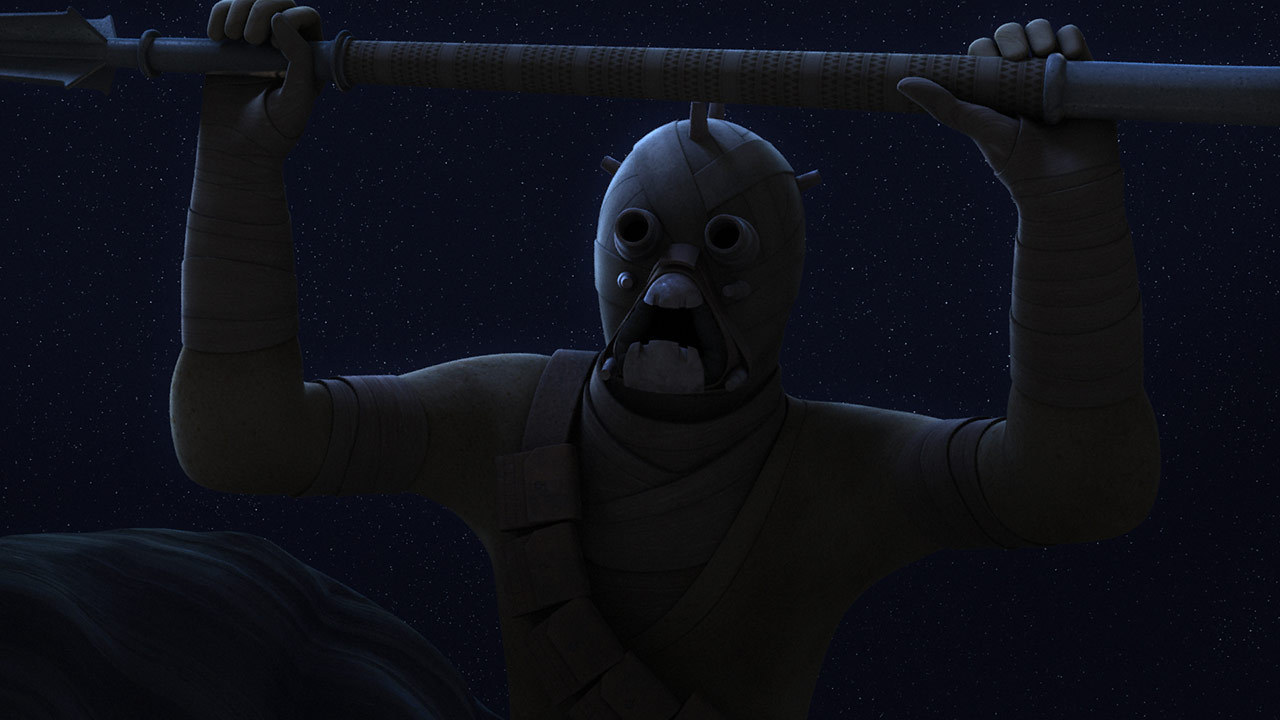 Ezra and Chopper soon find themselves under attack from several Tusken Raiders, who had been converging on the canyon. Under the cover of darkness, the Sandpeople attack the RZ-1T with gaderffii sticks and slugthrowers. Ezra returns to the trainer fighter, where he uses the Force to hurl away a Tusken Raider threatening Chopper. Chopper flees the ship with his rocket booster and dodges blaster bolts. Ezra tells Chopper to find cover while he takes position under the fighter.