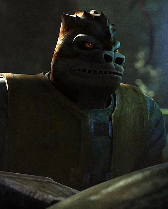 A Trandoshan male was a commander of a team, who helped the imperials to stripping the Kashyyyk of its resources and forcing it under Imperial rule. Babwa Venomor was contacted via hologram by the tank commander who informed[2] him[3] that their modified Armored Assault Tank Mk I crew and accompanying guards had encountered more standing stones blocking their path in the jungle. Venomor ordered the tank commander to destroy the stones and keep to the schedule before disconnecting; however, after setting the stones ablaze, the tank commander's group was attacked and killed by the Wookiee Jedi Gungi and his allies in Clone Force 99.[2]