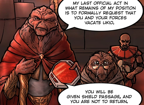 As the Republic forces recuperated after the battle, the liege was ousted from his office. Angered, he declared that his last official act would be to formally remove the Republic presence from his world. He confronted Generals Reus and Fisto, and demanded that they immediately depart. The turmoil surrounding Ukio during the battle had lowered the planet's stocks so severely that Corporate Alliance Magistrate Passel Argente was able to purchase the world's economy wholesale. Although the Republic had won a tactical victory, the Confederacy gained control of the planet as a result.[1]