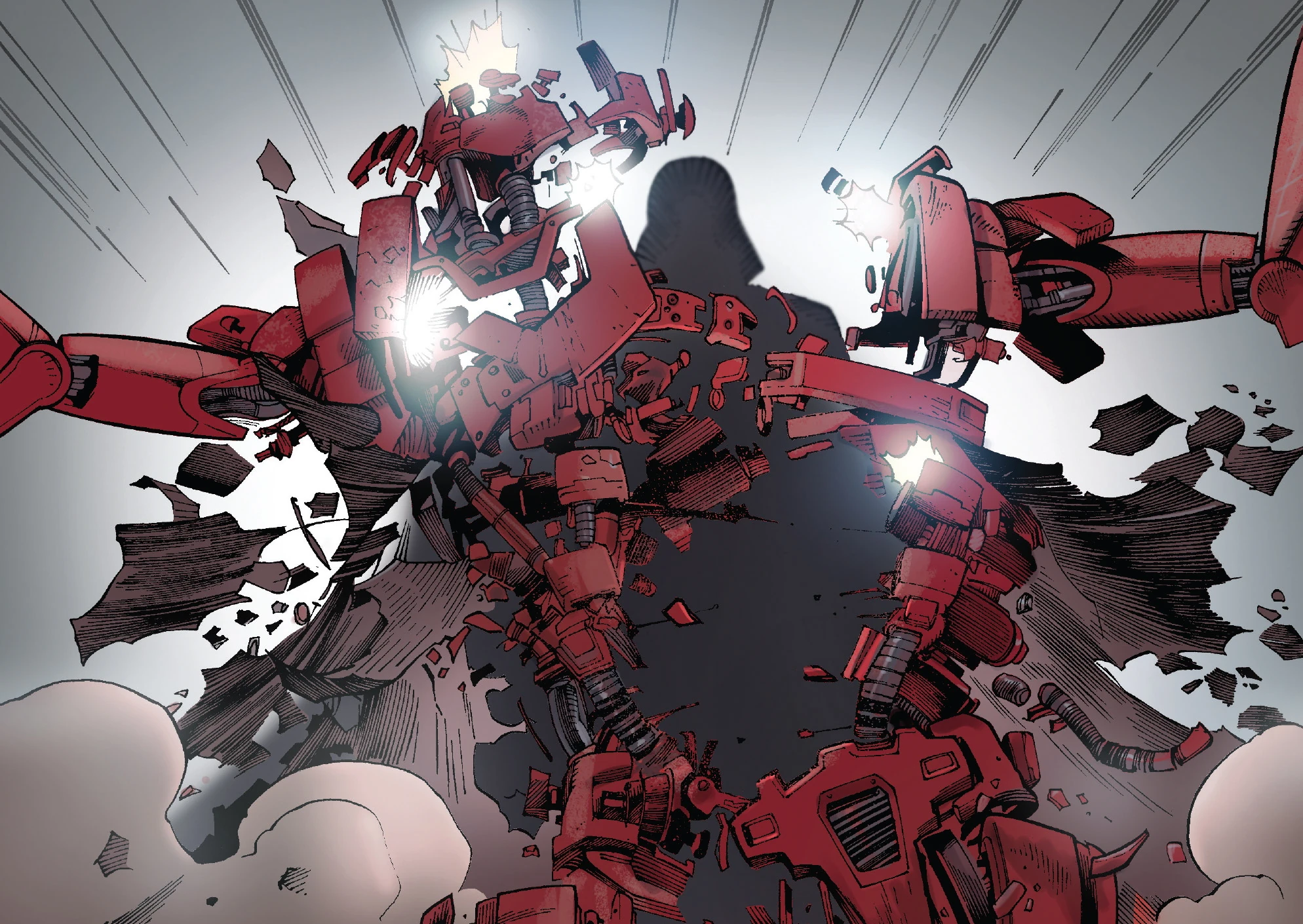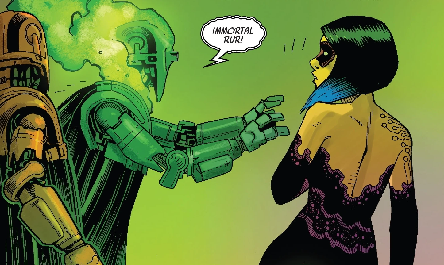 The red droid watches as its blue comrade becomes possessed by Rur.