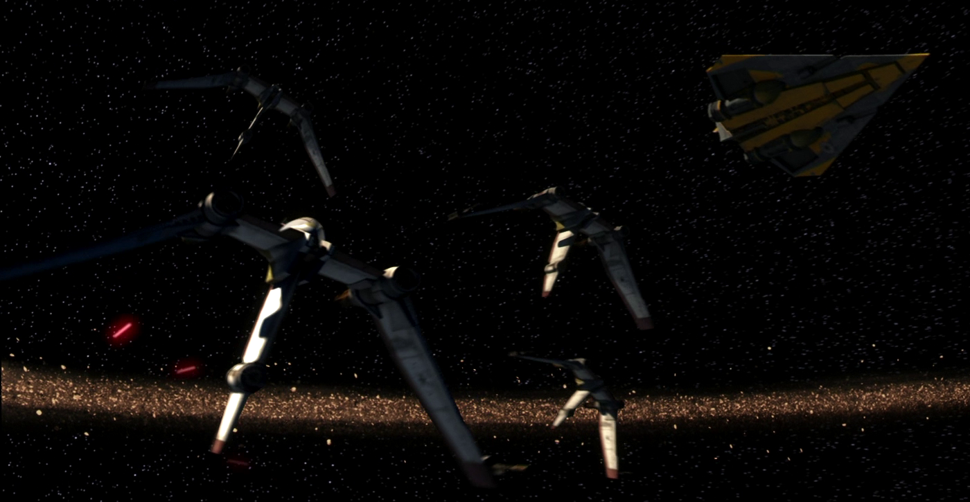 Following a recent string of defeats to Grievous in the Outer Rim Campaign, Gold Squadron, led by Anakin Skywalker, used V-19 starfighters to lure the cyborg general to a trap in Bothawui. However, the fighters were seemingly outmatched by the firepower of the Munificent-class star frigates of Grievous, resulting one of them being shot down. Anakin then ordered his squadron to break off the attack as he had AT-TE walkers under the command of Rex to destroy the Separatist fleet, giving victory to the Republic, though Grievous escaped the ensuing chaos.[16]
