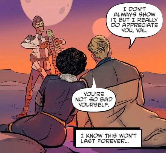 On the starship, Val was angry at Beckett for putting her in danger just to save one of his gambling buddies. But Beckett promised to Val that he had a surprise for her. When the ship landed Beckett brought out Val and surprised her with a relaxing sunset picnic and music provided by Jipps. Val called Beckett "fantastic" as the couple enjoyed the view.[7]