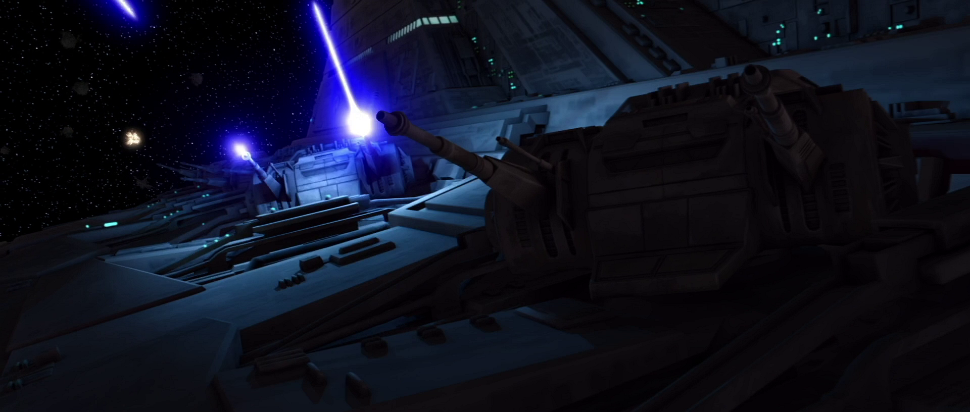 Another form of firepower came in the AV-7 Anti-vehicle Artillery Cannon, albeit mounted to the vessel without legs,[14] which could be operated by a single soldier and was also used as an artillery piece for Republic ground forces.[26] The Venator's artillery decks featured long rows of many such cannons that aimed approximately perpendicular to the length of the ship in order to fire at vessels across from it, usually at close range. The AV-7 cannons and their ammunition were susceptible to exploding if struck by enemy fire when Venators brawled with opposing ships.[14]