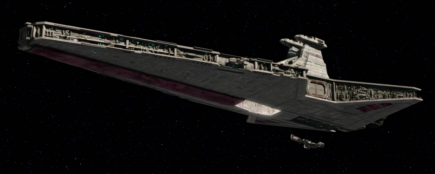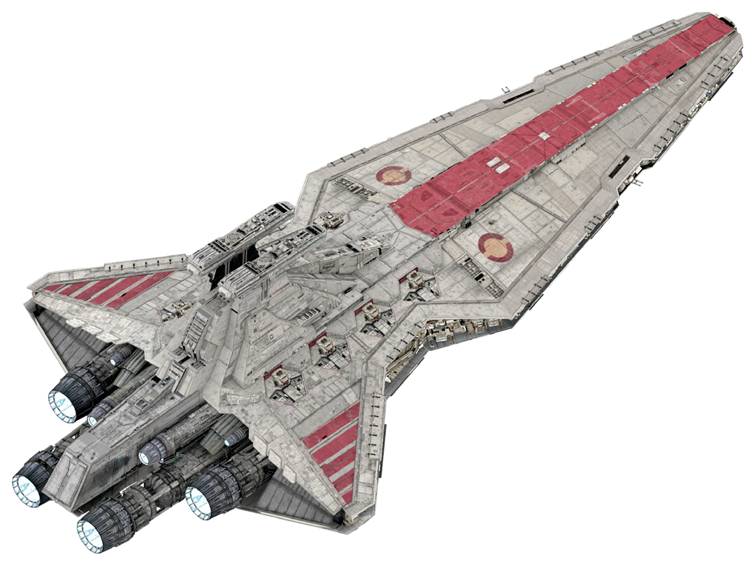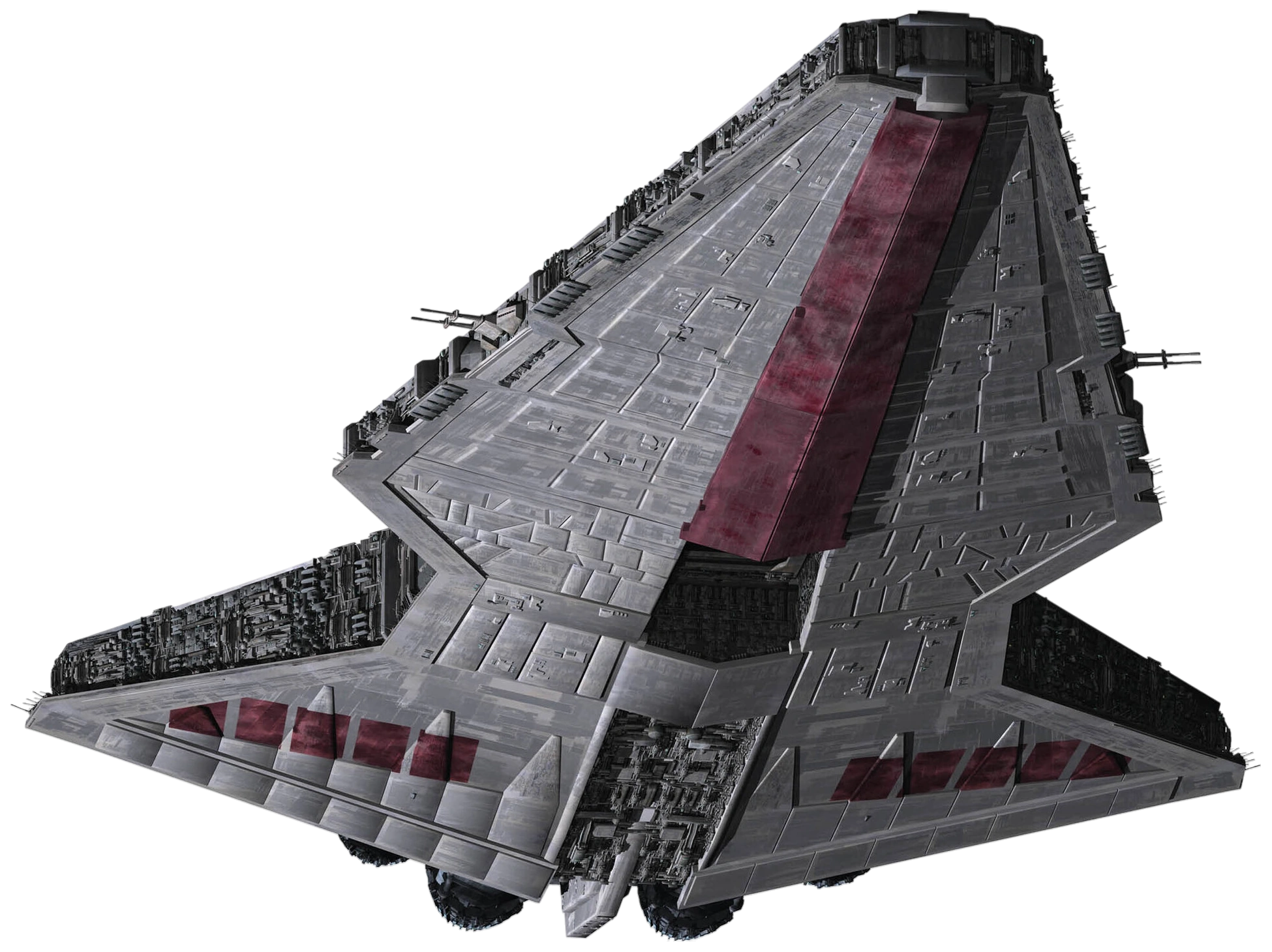 The Venator-class Star Destroyer, also known as the Venator-class cruiser, was a class of more than 1,000 meter-long attack cruiser of the Star Destroyer design family that was operated by the navies of the Galactic Republic and its successor Galactic Empire. Designed by Lira Wessex to feature a double-wedge design and perform a wide range of missions, the Venator was the first class of Star Destroyer to be manufactured by Kuat Drive Yards. Alternatively known as the Republic cruiser, Republic attack cruiser, or Republic Star Destroyer, it was a versatile capital ship capable of serving as both a combatant in ship-to-ship naval warfare and a starfighter carrier, while also being employed as a troop transport, cargo ship, and supply and replenishment vessel. As a warship, Venators were protected by powerful deflector shields and boasted a range of weaponry. For its carrier role, a large flight deck, along with hangars to accommodate a complement of starfighters, gunships, shuttles, armored vehicles and other craft, was contained in the forward section, while three more docking bays were located around the ship. At least two variants existed, the Venator I-class and the Venator II-class.