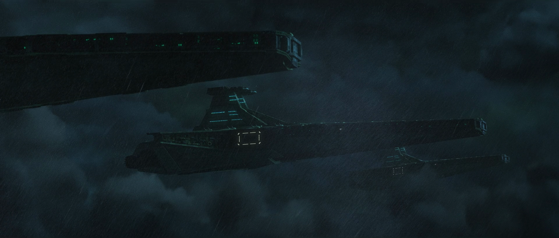 On the bridge of one of the Star Destroyers, Vice Admiral Rampart informed Governor Wilhuff Tarkin that all personnel and technology were safe in Imperial control. Tarkin then commanded him to destroy Tipoca City. The Venators proceeded forwards through the stormy clouds before pausing once the ships were in the correct position. Upon Rampart giving the order to clone navigation officers to open fire, the three warships unleashed a steady barrage from their starboard and port dual medium turbolaser cannons. Setting the city alight with fiery explosions, the turbolaser fire ripped through the domed buildings, toppled over platforms, and felled the underwater stilts, plunging the burning facilities into the depths of the ocean.[85]