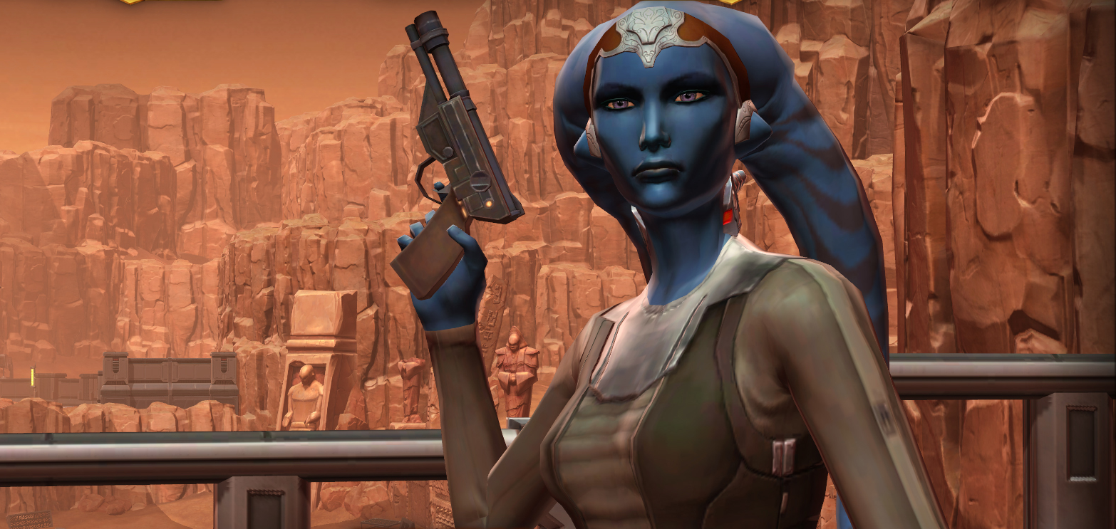 Having access to the HoloNet on the ship, Vette was checking the holo-frequencies of Taunt's gang and was relieved to find that the group was still alive, residing on Nar Shaddaa. They informed Vette that Cada Bliss, their Duros mark, was the one who set them up for Korriban job, getting his revenge on the ones who robbed him. Now having a fearsome Kaleesh bodyguard called The Virus, Bliss has obtained a priceless artifact of Twi'lek history called the Star of Kala'unn and was trying to find a buyer for it at the Mezenti Spaceport on Nar Shaddaa. Vette wanted to reclaim the Star of Kala'unn and pay back the one whose actions resulted in her second enslavement, convincing Baras' apprentice to accompany here. They confronted the Duros and Vette made a prepared speech, but the conversation turned violent and ended with the Sith killing the Virus, with Vette forcing Bliss to give up the Star of Kala'unn and promise her that he would reform. Having recovered the Star of Kala'unn, Vette reunited with her friends and handed over the Star to them to be put in a museum. She spend some quality time in their company, but when offered for her to rejoin them, Vette replied that she found her place with the Sith, although she assured that she would keep in touch.[3]