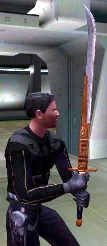 contained one 2.5 foot long blade, sharpened to a razor's edge, that could be activated instantly. The blades' cortosis weaves allowed it to parry the blows of lightsabers, energy swords, or blaster bolts.