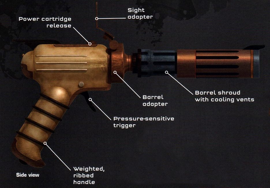 Vilmarh's Revenge, also known as a precision laser dart,[2] was a popular blaster pistol model manufactured by DevTech Sidearms. The weapon was easy to customize to one's liking, as the barrel adapter could fit various kinds of attachments. Vizago's pistol, for example, had a barrel shroud receiver with cooling vents. The Vilmarh's Revenge had a long distance sight adapter that can fold down and a pressure-sensitive trigger. Increased pressure on the trigger would result in an increased rate of fire.[1]