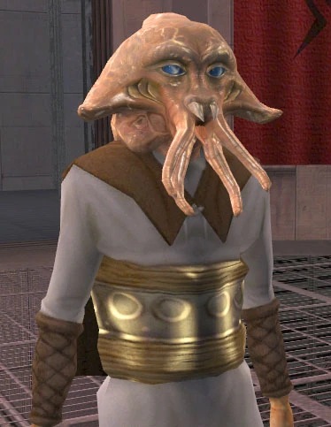 Knowing that the Jedi appeared whenever there were oppressors and oppressed people, he ordered Saquesh—his representative in the Refugee Sector of Nar Shaddaa, also a Quarren—to start driving the refugees away. However, even though there were rumors of a Jedi present on Nar Shaddaa—true rumors, speaking about Master Zez-Kai Ell—that Jedi seemed not to be endangering himself by intervening into the conflict between the Exchange and the refugees. Some time had passed before another Jedi, Meetra Surik, appeared on the Smugglers' Moon and drove Saquesh and the Exchange out of the Refugee Sector.[1]