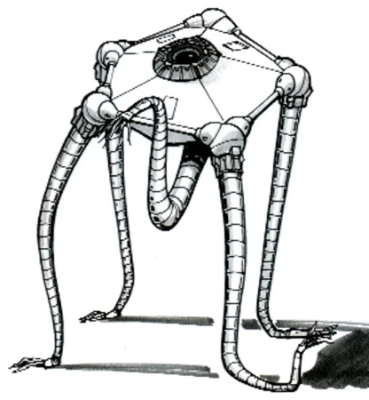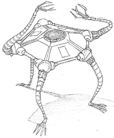 Vuffi Raa stood one meter tall and resembled an attenuated starfish with five elongated chromite tentacles. His main body was pentagonal in shape and made of polished chromite. In the center of his body was a powerful multi-frequency photoreceptor capable of seeing in ultraviolet and infrared wavelengths. Vuffi also had a range of other sensors and a miniature vocabulator hidden in his underside.[2] Furthermore, he was powered by a microfusion pile, a near-infinite source of power.[4]