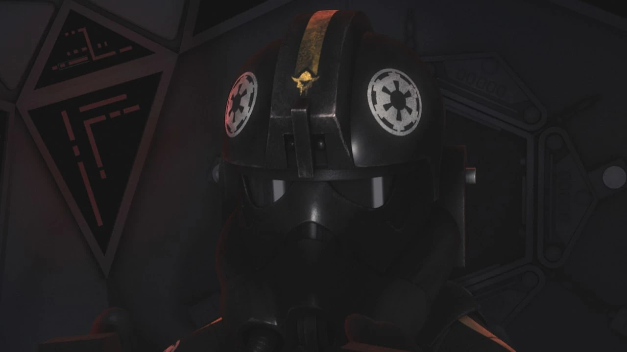 As a TIE fighter pilot, Skerris wore a TIE pilot's uniform designed to reflect his unique status; the suit had yellow stripes on either side of the body and arms, and the flight helmet featured a yellow stripe and a horned insignia on its crest ridge.[3] By the time of the battle in the Lothal system, the insignia was used on his TIE Defender Elite, which also sported yellow markings that matched his uniform.[18] During the pursuit of the Ghost, he piloted a TIE Defender prototype after he was personally handpicked as the test pilot by Thrawn.[6]