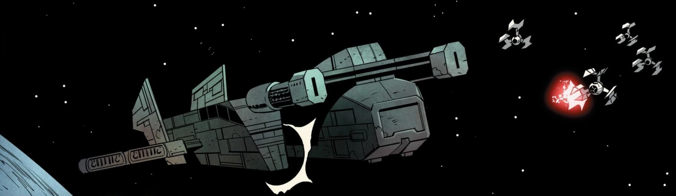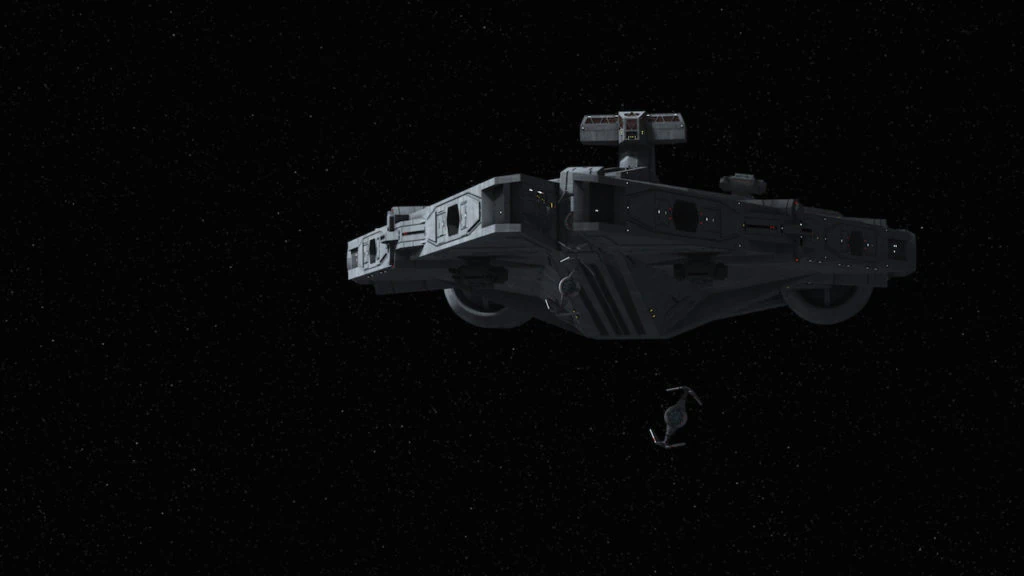 Unable to jump to lightspeed in order to avoid detection, the Darkhawk drifted toward the vessel as the freighter had traveled deep within Batuu's gravity well. The Grysk vessel departed Batuu's orbit and attempted to flee after detecting the freighter. Piloting their TIE Defenders, Defender Squadron One then flew past the Darkhawk, and Skerris announced the unit's presence to Kimmund. The commander explained his crew's objective to capture the vessel intact and asked if Skerris' unit could damage and prevent it from escaping. The pilot obliged and noted that Faro had also suggested the same action. When the Grysks fired upon the squadron, Defender Squadron One evaded their attacks and proceeded to damage the vessel. After Skerris and his squadron finished their attack run and created an opening in the ship's aft, the pilot asked Kimmund if the Darkhawk's crew required another entry point in the vessel for boarding. Instead, Kimmund requested that the squadron pursue the vessel's escorts, and Defender Squadron One obliged.[4]