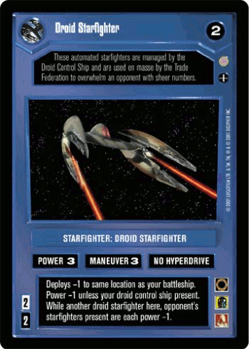 Like most of the Trade Federation's armed forces, it carried no living pilot, but rather a droid brain that was linked to a central control computer, often aboard a Lucrehulk-class Droid Control Ship. Each Trade Federation battleship carried 1,500 such droid starfighters.