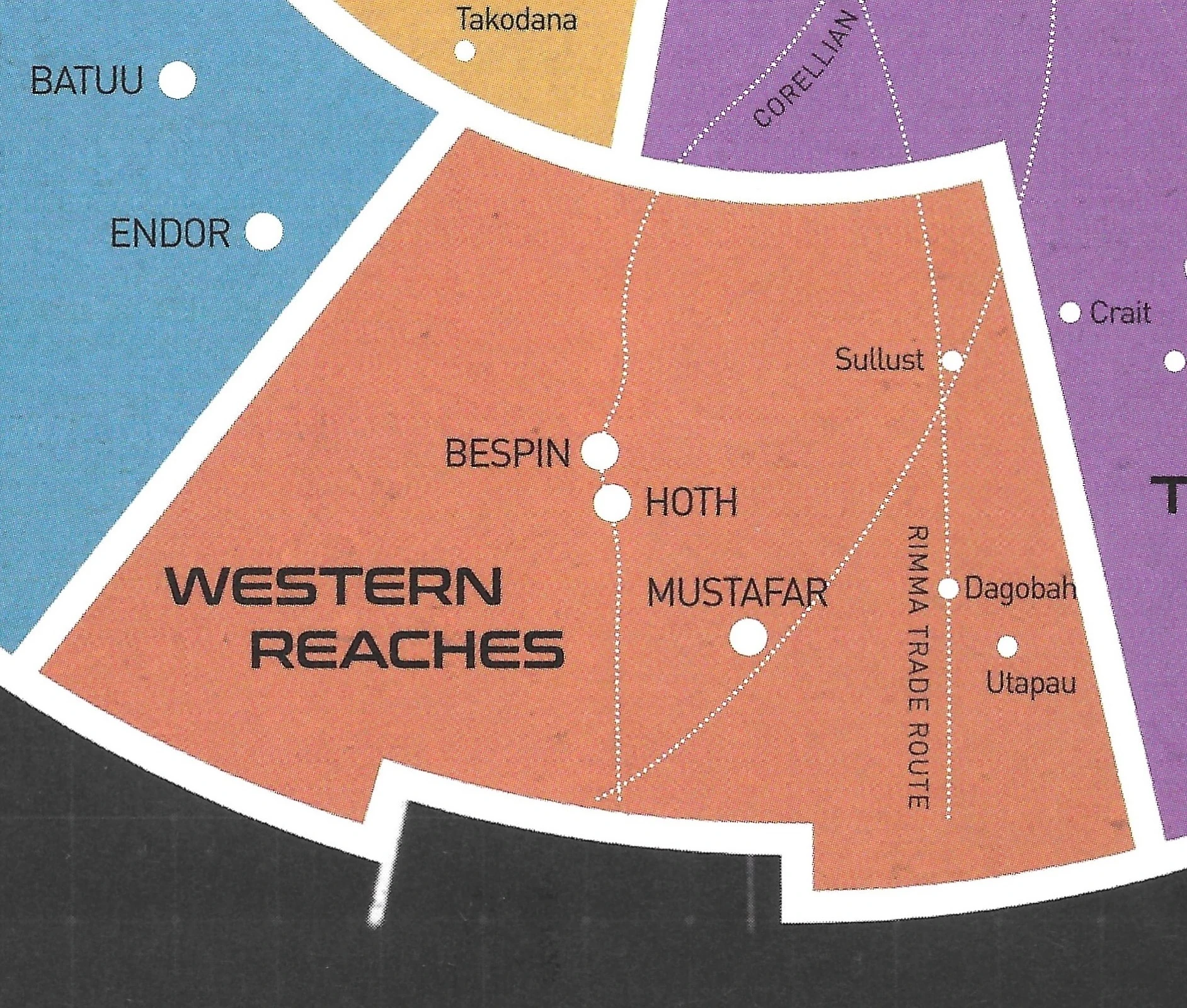 The Western Reaches, also known as the Western Regions, comprised an area of the galaxy.[10] The Western Reaches overlapped with several other regions of the galaxy, including the Outer Rim Territories,[11] the Mid Rim Territories.[2]