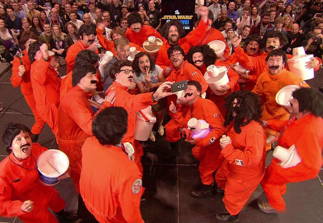 Willrow Hood first appeared as an extra in the film Star Wars: Episode V The Empire Strikes Back,[1] released on May 21, 1980.[8] The character was initially identified by the Legends Star Wars Customizable Card Game[9] released in 1997, with his name being brought into canon by the Star Wars: Card Trader digital app.[3] Based on the ice-cream-maker-like prop Hood carries in the film, he is often known to fans as "Ice Cream Guy," "Ice Cream Maker Guy," or "Ice Cream Man."[10][11][12] A tradition was established at Star Wars celebration called "The Running of the Hoods" in which fans dress up in orange jumpsuits similar to Hood's, put on fake mustaches, and run around the convention with ice cream makers. This has given the character somewhat of a hero status among fans.[13]