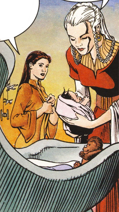 Upon the conclusion of the Thrawn crisis, Winter became the caretaker of Leia Organa Solo's newborn twin children, Jacen and Jaina. Leia's brother Luke Skywalker was concerned that the Force-sensitive children would be particularly vulnerable to attack (Imperial or otherwise) during their first two years of life.[31] Therefore, the decision was made to sequester the children for several years, at the same time freeing their parents, Leia and Han Solo, for important New Republic duties. Initially, Winter kept Jacen and Jaina on New Alderaan with the protection of the Noghri.[32] However, the depredations of the resurrected Palpatine and the birth of the twins' younger brother Anakin necessitated a change in both locations and strategies.[33]