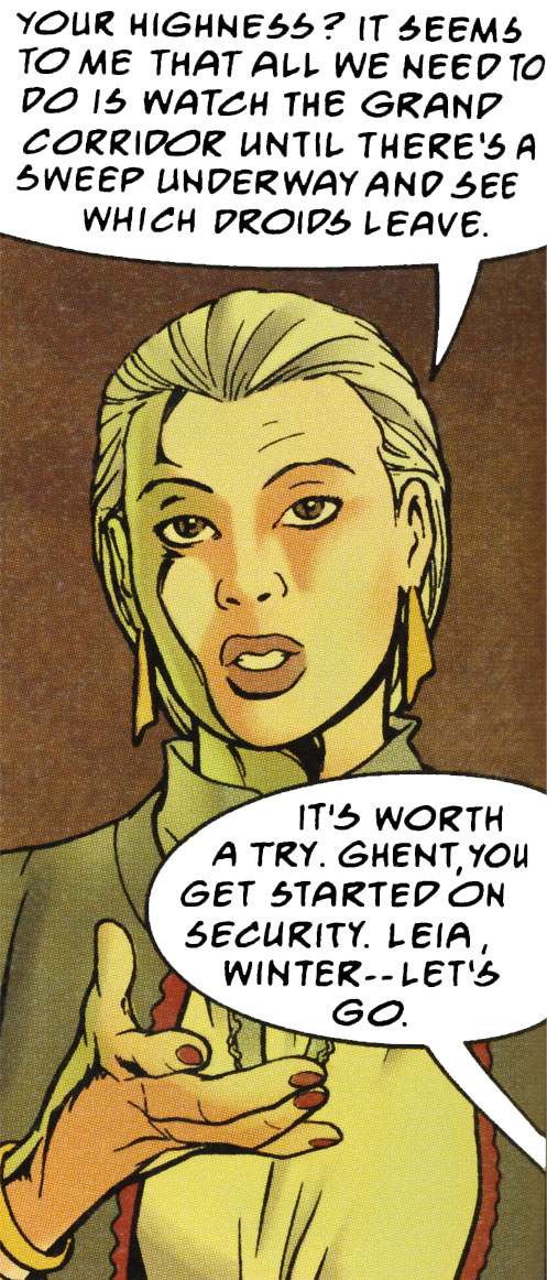 As Leia recuperated from the delivery of her twin children Jaina and Jacen, Winter began probing the old Rebel Alliance archives for information about possible Imperial agents within the government. Suspicious of Mara Jade's recognition of her as Targeter (thought to be known only to a few Imperial agents on Averam), Winter informed Leia that Mara might have Imperial connections. This information led Leia to confront Mara about her past. Soon thereafter, Winter was present for the attempted kidnapping of Leia and her children. Mara Jade's timely rescue helped to ease Leia and Winter's minds about Mara's allegiances. As a result of this event and concerned for the safety of the infant Solo twins in the face of continued danger, Leia invited ten Noghri bodyguards to Coruscant to protect her, the twins, and Winter. This proved to be a fortuitous decision—when Coruscant came under attack a few days later, Leia's political duties called, and it fell to Winter and the Noghri to defend the twins. This presaged a pattern that would hold for most of the twins' childhood.[13]
