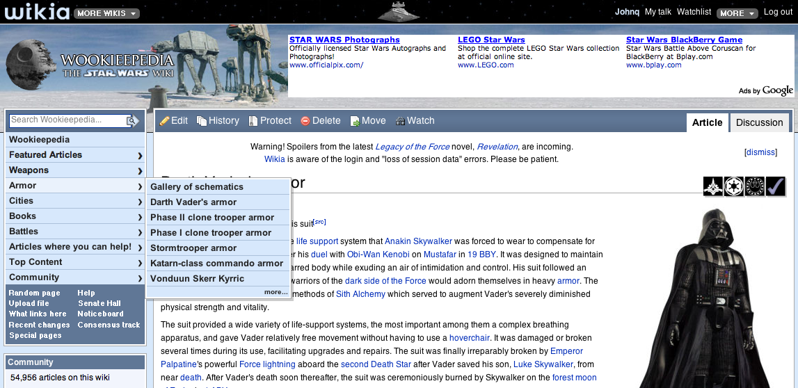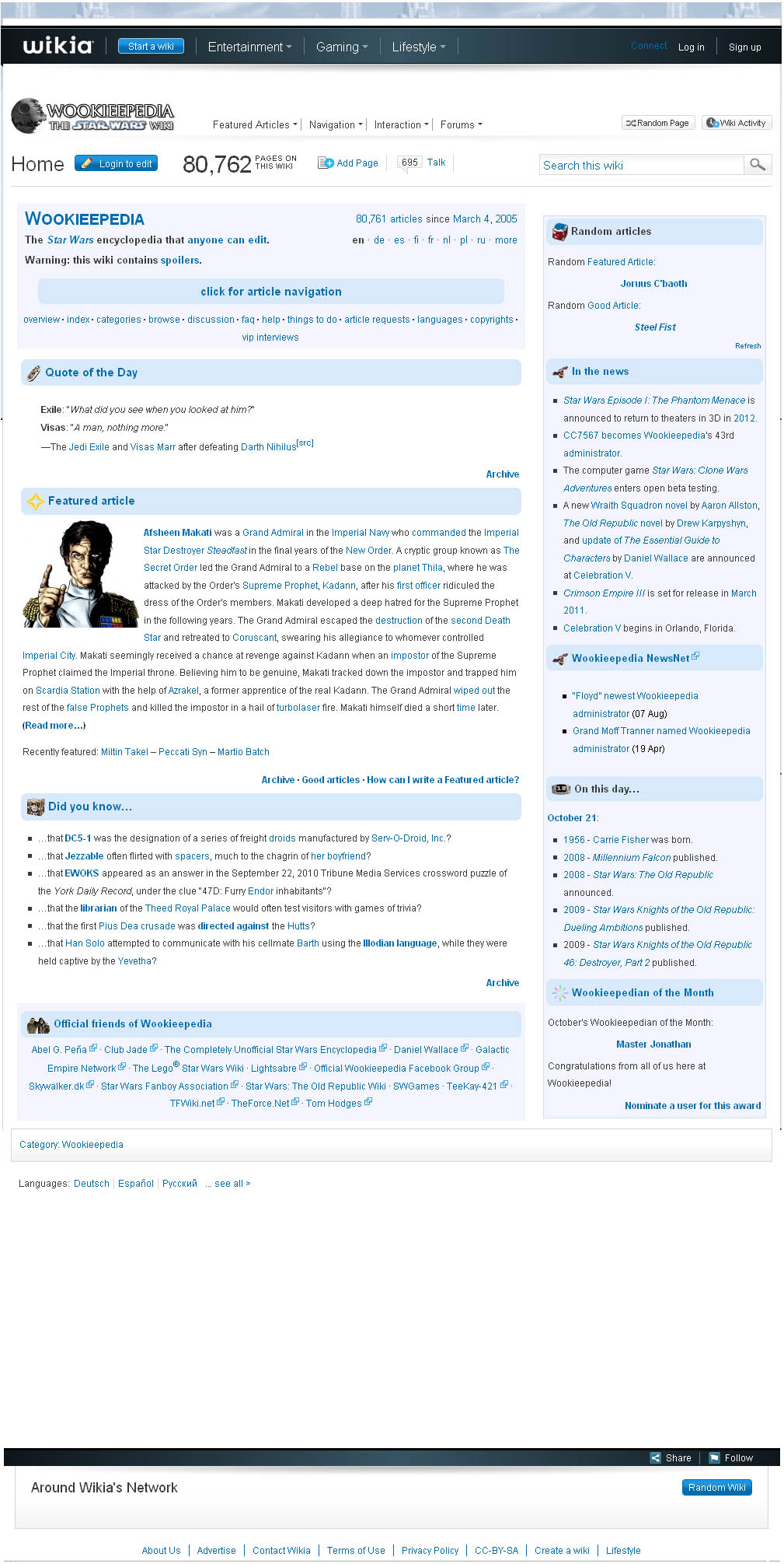 Wookieepedia's Main Page in the Wikia skin, October 2010.