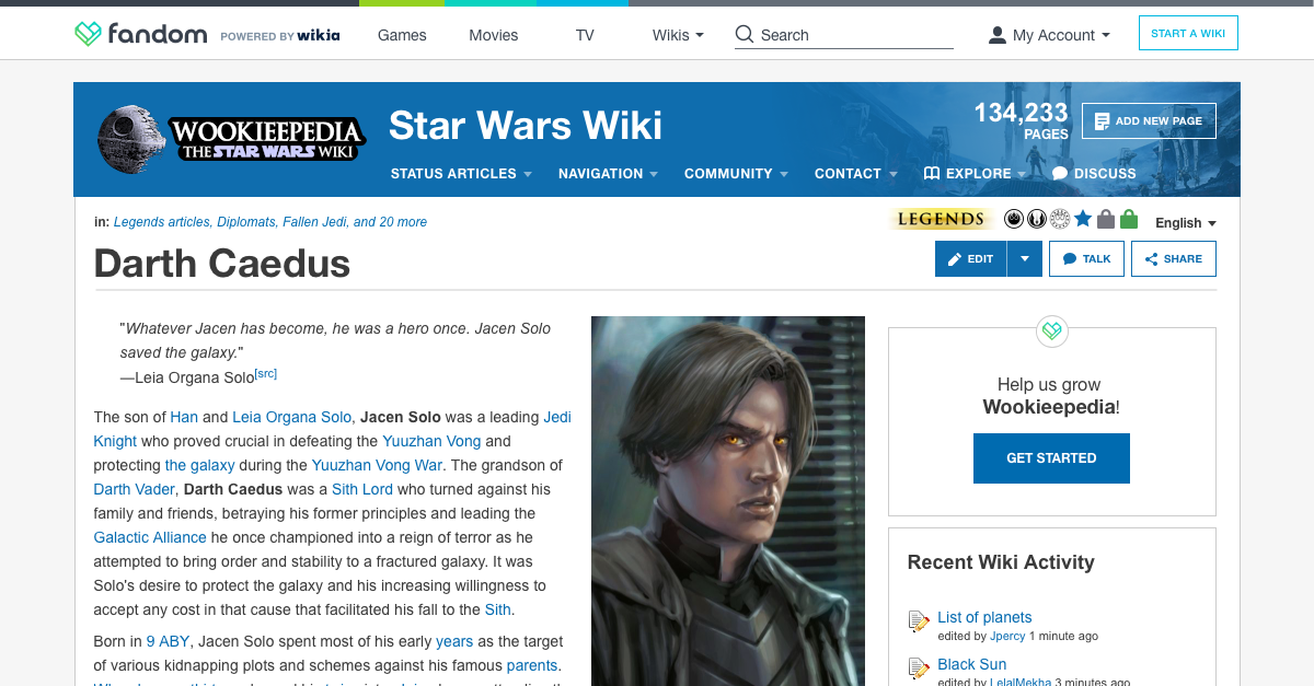 Wookieepedia's Darth Caedus article in Oasis skin, March 2017