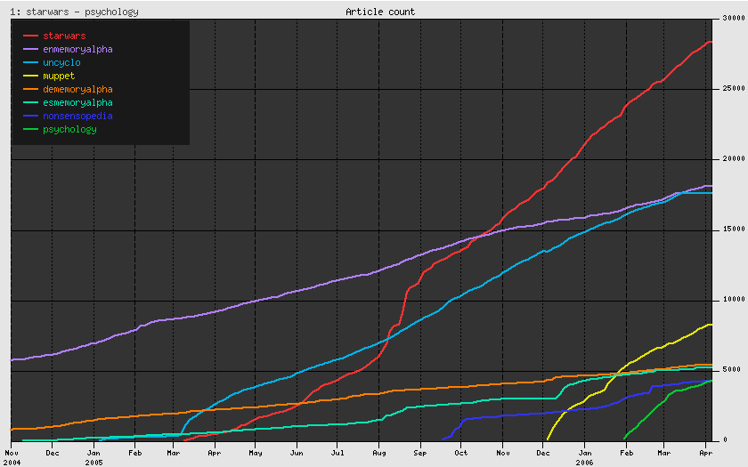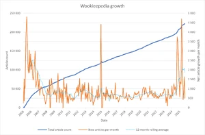 July brought the first Quotes of the Day on Wookieepedia. The number of quotes later increased and passed through four subcategories, and QotD/In-Universe was the most edited page on Wookieepedia for a time.[15] In the same month, Wookieepedia's largest ever boost came when an explosion of editors hit the site, sending the wiki's article count over 10,000. Factors to this expansion could be attributed to advertising and the release of Star Wars: Episode III Revenge of the Sith. By the end of the year, Wookieepedia's article count had surpassed 20,000. (See wiki growth table below.)