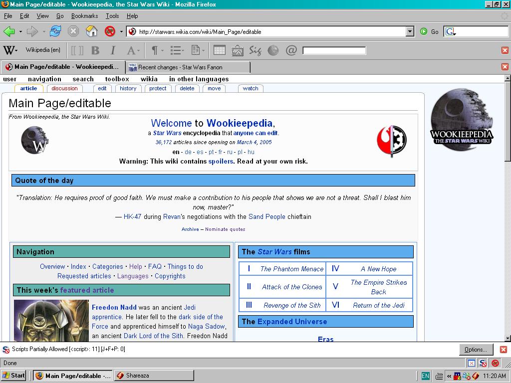 Chad Barbry, under the screenname of "Cbarbry," was a regular contributor to Wikipedia since October 17, 2004.[4] So was Steven Greenwood, under the screenname of "Riffsyphon1024," since January 5, 2005.[5] Greenwood soon started sorting the various Star Wars articles on the site. As Wikipedia was concerned, only notable items would have complete articles, with the rest of the minor subjects with descriptions on a giant list. Planets, characters, weapons, and vehicles were all done in this manner. Over a short period of time, Greenwood found that he disliked this format and sought another way to gather and place information on the saga and its Expanded Universe.[6][2] On January 21, Greenwood posted on a section on a talk page regarding the creation of a new Star Wars Portal, but suggested that instead of a portal it should be a wiki, citing Halo Wiki (now Halopedia) as inspiration, as well as TheForce.net's Completely Unofficial Star Wars Encyclopedia.[3]
