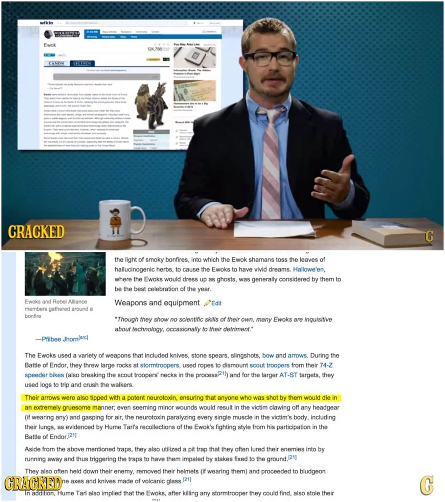 - On January 18, 2016, Cracked.com's Obsessive Pop Culture Disorder, hosted by Daniel O'Brian, covered Ewoks and the dark secret behind them as vicious man-eating monsters. When citing their usage of poison-tipped arrows, the video directly cites Wookieepedia as a "thoroughly researched database" and references the Legends tab of the Ewok article. The video highlights text within the Weapons and Equipment section, attributed to Jason Fry's The Essential Guide to Warfare. The screen grab was made when Wookieepedia's article count registered 124,788.[180]