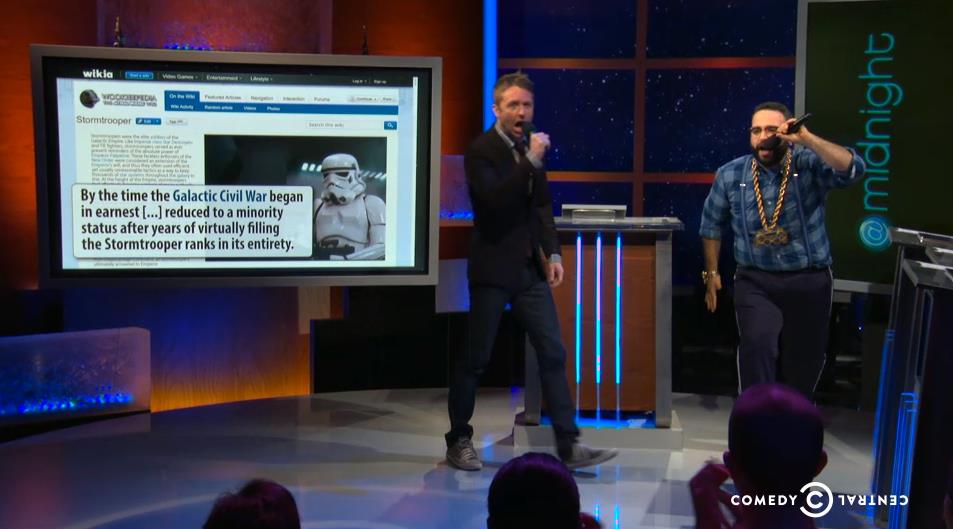 - On December 1, 2014, after the release of the first teaser trailer for Star Wars: Episode VII The Force Awakens, @midnight once again featured Wookieepedia to explain to fanboys upset with John Boyega apparently as a black stormtrooper that stormtroopers were no longer clones by the time of the new film. This episode with Tom Papa, Dave Hill, and Morgan Murphy involved displaying a version of Wookieepedia's stormtrooper article, with Chris Hardwick and his "hype nerd" reading various lines from the article. Emphasis was given to certain clips of information, particularly in how Jango Fett's clones were marginalized. It should be noted that the article in question was the Legends stormtrooper article.[158][159]