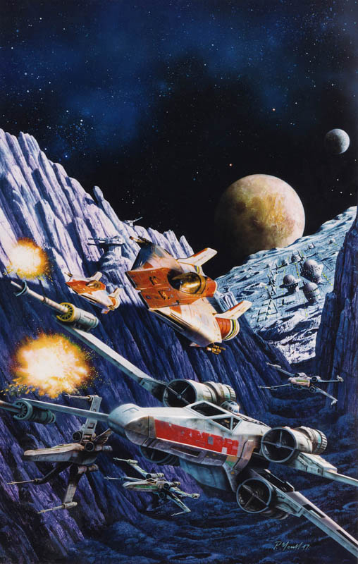 As the Implacable approached, the fighters remained grounded at the base while the facility's transports were loaded. The Imperials launched their first strike on an abandoned mining outpost rigged to emit signal transmissions, and the New Republic forces, on the far side of the moon, began powering up their engines in preparation for evacuation. While the transport Bright Nebula launched without problems, the Borleias sustained an engine malfunction. To buy the craft time to escape, General Crespin, personally leading Blue Squadron in his A-wing, ordered the Wraiths and Blues to delay the Imperial assault force. Antilles and Crespin dispatched two pilots from each of their units to hide in the Pig Trough ahead of the others with their engines powered down. When the Imperials flew over, they would activate their fighters and ambush them. Tainer and Ekwesh of Wraith Squadron and Dorset Konnair and Tetengo Noor of Blue Squadron were assigned this duty.[1]