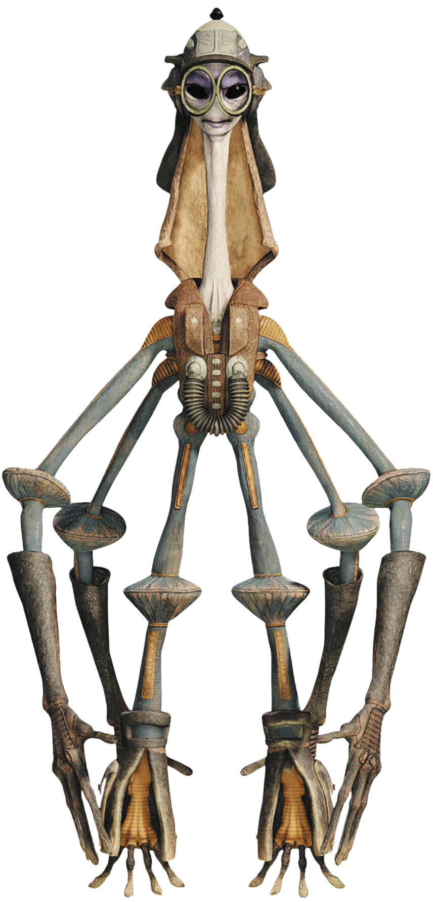 Adapted to live in woodland habitats,[8] Xexto were a sentient alien species[1] identifiable by their pale-colored skin,[2] and six[1] long limbs,[6] which afforded them a total of twenty-four digits.[7] They used their bottom pair of limbs as legs.[2] Atop a tall, thin neck,[6] each Xexto had a head that featured a thin mouth and two black[2] or red eyes.[5] At least one Xexto, the Podracer pilot Gasgano, exhibited purple-colored skin above his eyes,[2] a trait that not all members of the species possessed.[5] Female Xexto could grow eyelashes and brown hair.[4] A slight Xexto, Gasgano stood at a height of 1.22 meters.[1]