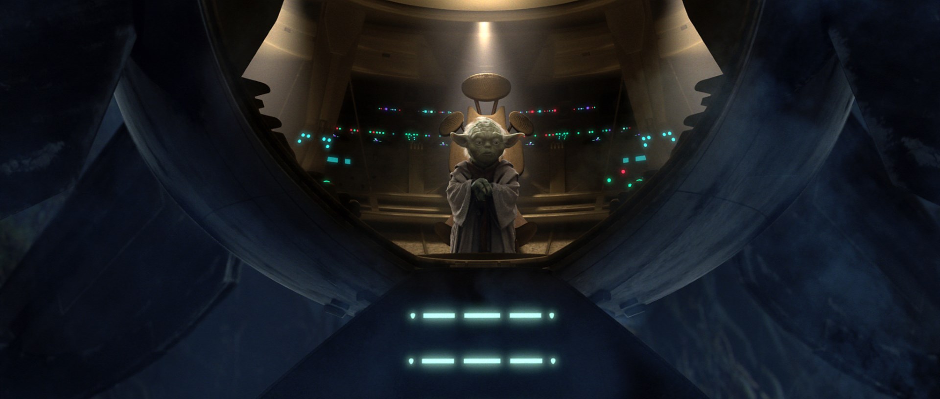In 382 BBY, after learning of the Battle of Jedha and the failure of a peace treaty between the warring planets Eiram and E'ronoh there, Yoda went to the Republic Executive Building on the galactic capital Coruscant to meet with with Supreme Chancellor Kyong Greylark while they waited for more information from Jedha. They spoke to Jedi Master Creighton Sun and Jedi Knight Aida Forte, who were on the ground on Jedha and confirmed that the E'roni ambassador was dead and the Eirami had deployed a droid army. They requested to perform an investigation on the Outer Rim Territories planet Dalna of the Path of the Open Hand cult, considering their involvement in the failure of the peace talks, the fact that Jedi Master Silandra Sho felt a disturbance that made the Jedi ill at the Path's almshouse, and that Jedi Knight Gella Nattai believed the Chancellor's criminal son Axel Greylark was working with the Path. Yoda admitted that he had sensed a disturbance beyond Jedha, and emphasized that they need to be careful, reminding them that there was always those who thrived in chaos. After much deliberation, Yoda and Chancellor Greylark eventually agreed to a fact-finding mission accompanied by two of her guards and to send Jedi Master Char-Ryl-Roy and Padawan Enya Keen to Eiram and E'ronoh to try and keep the peace and discover what was causing communications buoys to be down, Yoda explaining to them that Werth Plouth, the Path's Herald, was responsible for the riots on Jedha.[31]