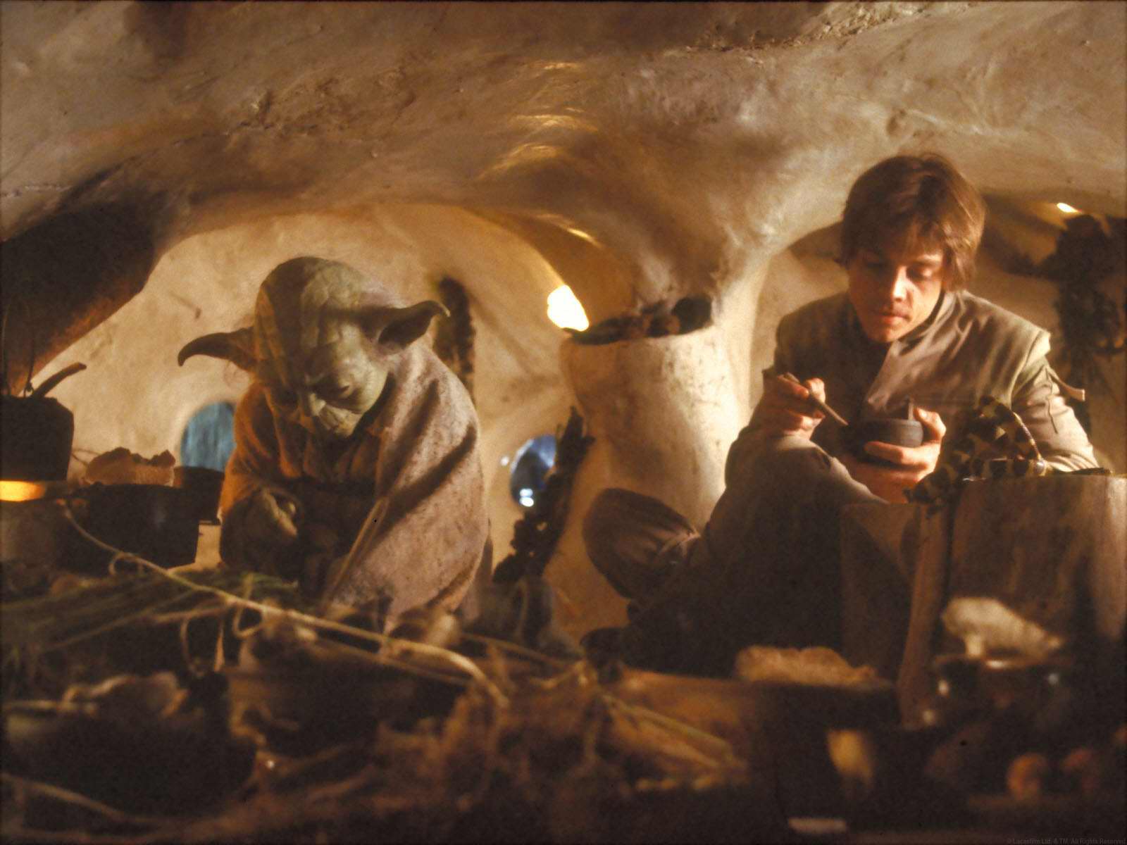 - "The idea of using another person, perhaps an alien, for Luke to play off of came up during story meetings. George Lucas and Leigh Brackett thought that the alien could be an Indian desert type, very childlike even though he's an old man. He at first should be repulsive and slimy but then should become kind and wise. He appears as a crazy little nitwit that goes around scurrying like a rat but ultimately teaches Luke a great deal about the Force."