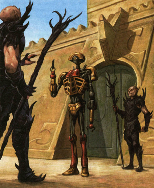 Two Yuuzhan Vong confronting an FEG-series pilot droid
