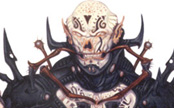 Yuuzhan Vong had sloping, almost ridge-like foreheads. Several Yuuzhan Vong had been seen with pointed ears, while just as many had been seen without them. These could have been ritual mutilations, or a genetic variation; there is no conclusive evidence as to what the species' norm was. Yuuzhan Vong also had short, stub-like noses, making their faces appear skull-like.[6] The Yuuzhan Vong usually had black hair, though in lesser amounts on both the head and body than Humans, but often wore it much longer than them (in many cases, they were also completely bald). Small blue sacks could be found under the eyes of the Yuuzhan Vong, and they were often considered a mark of beauty.[7] These eyesacks expanded and contracted to reflect a Yuuzhan Vong's mood, as the species did not use the facial expressions preferred by Humans.[8] Through the blue sacks under their eyes, they were capable of telling if an individual was in delight or were suffering from rage.[9] The most common skin tone among the Yuuzhan Vong was gray, with the second most common being yellow. Another major characteristic was their jet black blood.[8]