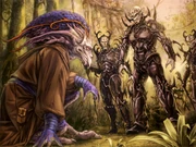 From Sernpidal, the Yuuzhan Vong returned to and conquered Dubrillion and Destrillion before moving onto Dantooine, where refugees from Dubrillion that had been evacuated by Lando Calrissian were being sheltered, precipitating a terrible massacre.[8] During the battle, the Yuuzhan Vong first unleashed legions of reptoid Chazrach slave soldiers and beetle-like thrall herders, both creatures from their galaxy. Among those on the New Republic side were Anakin Solo and his older brother, Jacen. The two brothers would discover that these Chazrach were entirely mindless and were merely the Yuuzhan Vong's equivalent to battle droids. They slaughtered dozens of Chazrach and Luke Skywalker also destroyed a thrall herder, causing much of the enemy force to scatter and allowing the refugees to escape Dantooine before the enemy conquered it.[8]