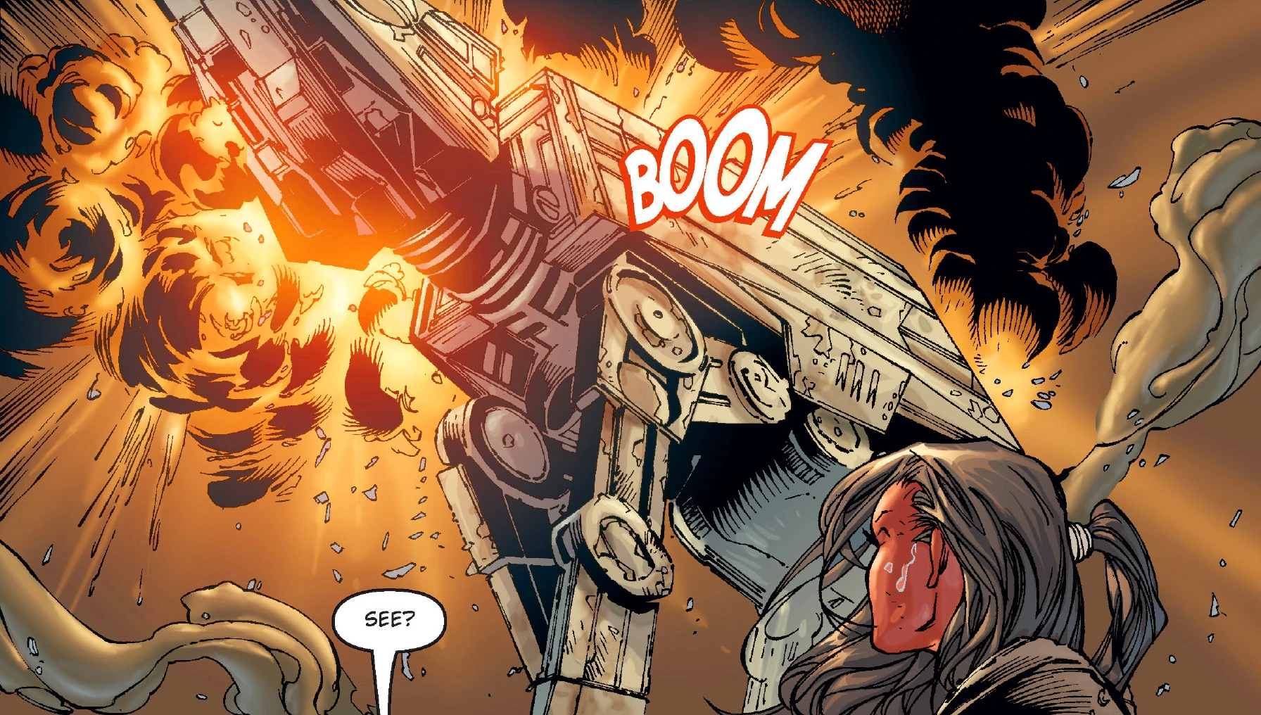 Embracing the anger that her Masters had long warned against, Xiss was able to kill many members of the Nimbus Commandos. Fighting in the shadow of one of the Republic's few remaining AT-AT walkers, Xiss maimed a Nimbus and prepared to execute him. However, before she could, the AT-AT was hit by heavy fire and fell to the ground, crushing Xiss and the commando.[3]
